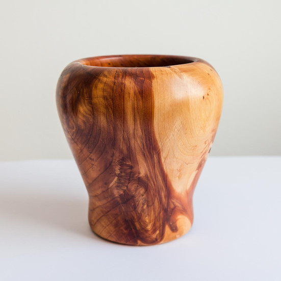 Je nach Objekt erhalten die Stücke zum Abschluss noch eine hauchdünne Wachspolitur, die für einen dezenten Glanz sorgt und das Holz vor stärkeren Einflüssen bewahrt. Wie z.B. bei dieser Vase aus Virginia Wachholder.